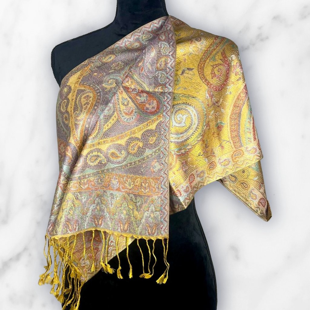 Tato úzká šálka je vyrobena ze 100% morušového hedvábí, které je známé pro svou výjimečnou jemnost, lehkost a decentní lesk. Zlatá barva dodává šále slavnostní i elegantní nádech, díky čemuž se stává skvělým doplňkem k šatům, halenkám nebo i formálním outfitům. Je vhodná jak na běžné nošení, tak na speciální příležitosti.