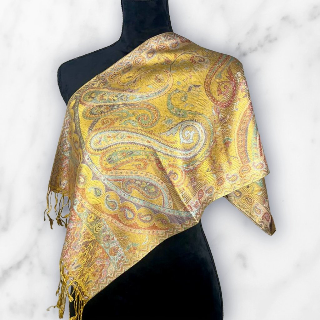 Úzká šála ze 100% morušového hedvábí v elegantní zlaté barvě. Lehká, jemná a lesklá – ideální jako luxusní doplněk pro denní i večerní outfit.