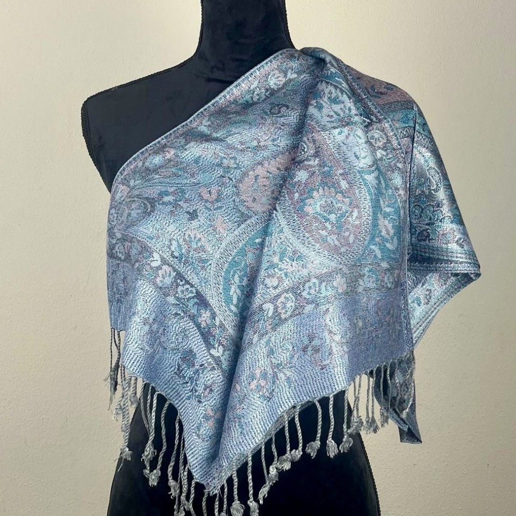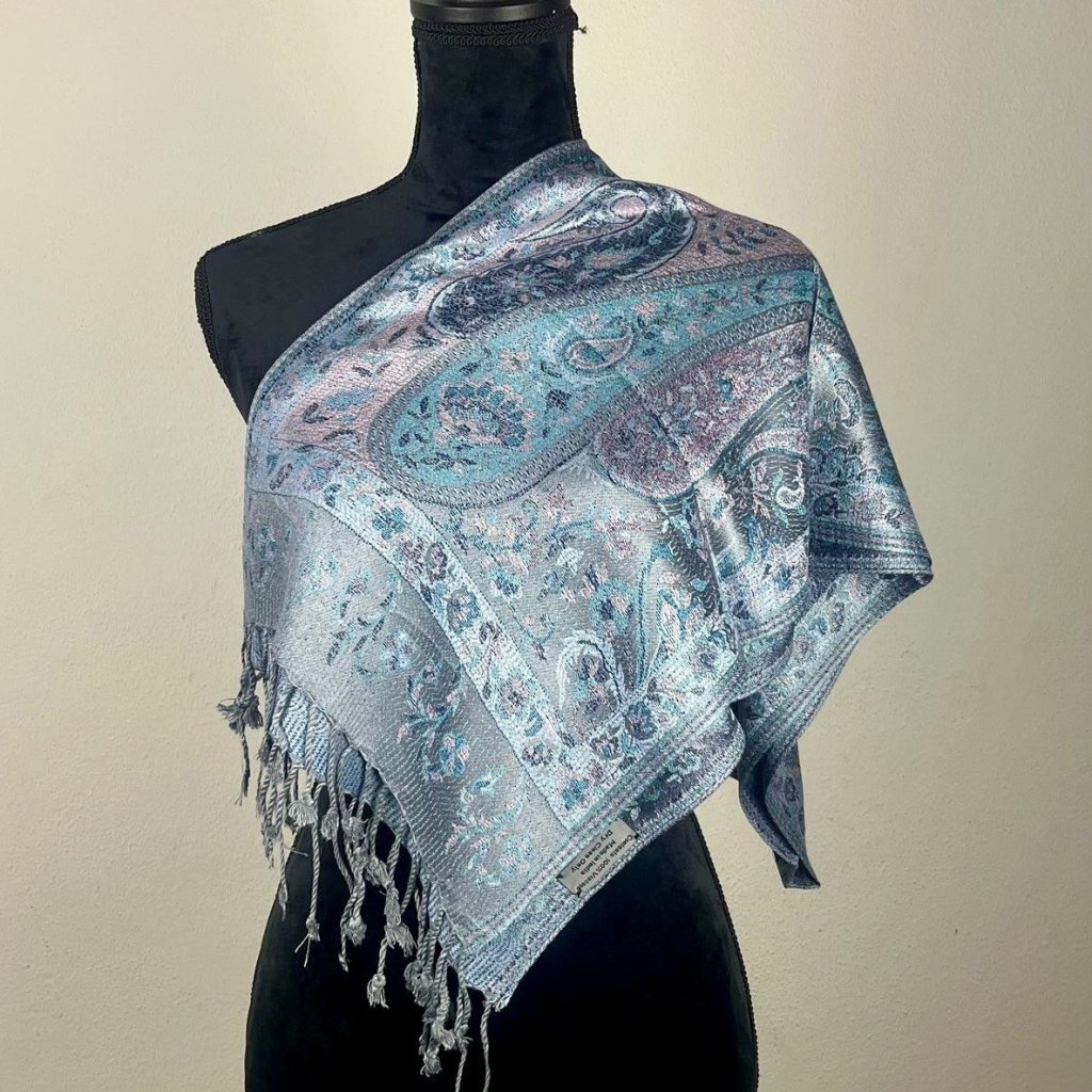 Tato úzká šála z pravého hedvábí v modro-stříbrné kombinaci působí luxusně, ale zároveň velmi jemně. Hedvábí je hebké, splývavé a přirozeně lesklé – ideální na elegantní zavázání kolem krku, jako dekorace do vlasů nebo jako jemný akcent ke kabelce či saku. Stříbrné odlesky dodávají šále slavnostní nádech, modrá barva zase klid a hloubku.