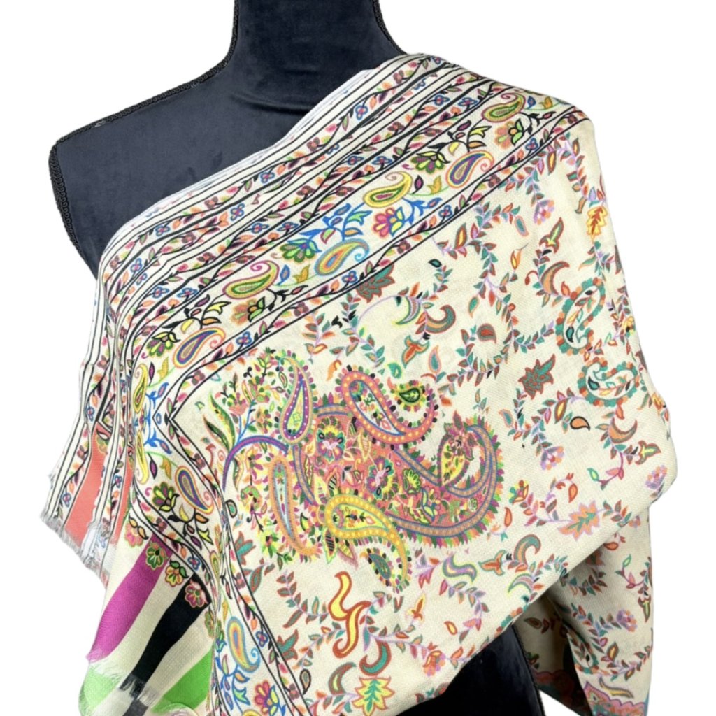Výrazná, ale stále jemná – tahle modalová šála zaujme bohatým orientálním vzorem inspirovaným Indií. Krémový podklad doplňují pestrobarevné paisley a květinové motivy v tónech růžové, zelené, modré a zlatavé.