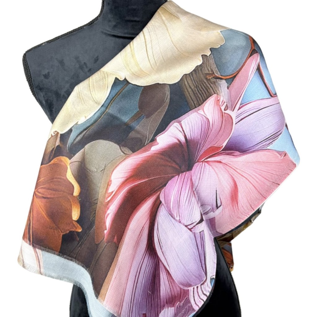 Lehká modalová šála s výrazným velkoformátovým květinovým motivem v jemných, elegantních tónech. Dominantní květ v odstínech růžové a lila doplňují tlumené barvy modré, béžové a hnědé, které vytvářejí harmonický a sofistikovaný celek. Šála působí velmi žensky a jemně, přesto zaujme na první pohled.