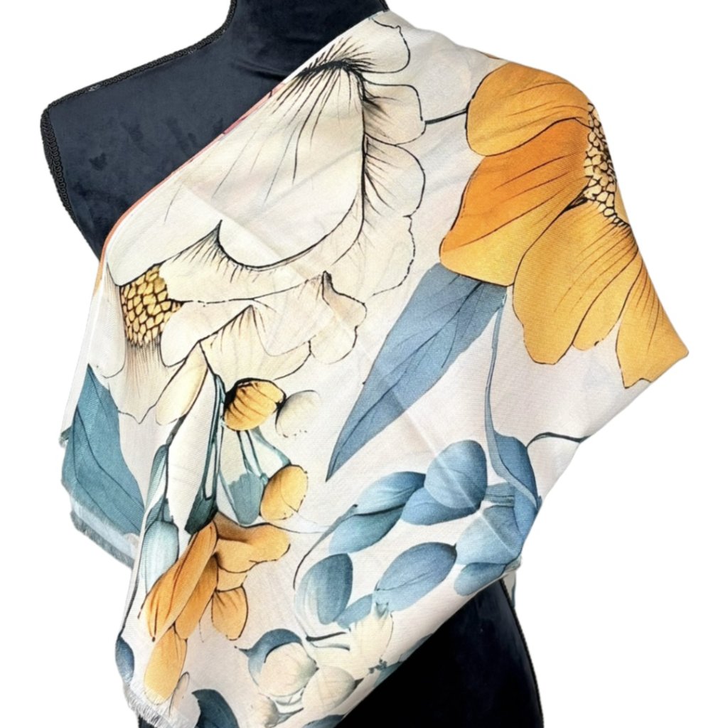 Lehká a vzdušná modalová šála s něžným květinovým vzorem v harmonické kombinaci krémové, hořčicově žluté a tlumené modré. Velkoformátové květy s jemnou kresbou dodávají šále moderní, přesto nadčasový vzhled a působí velmi elegantně a svěže.