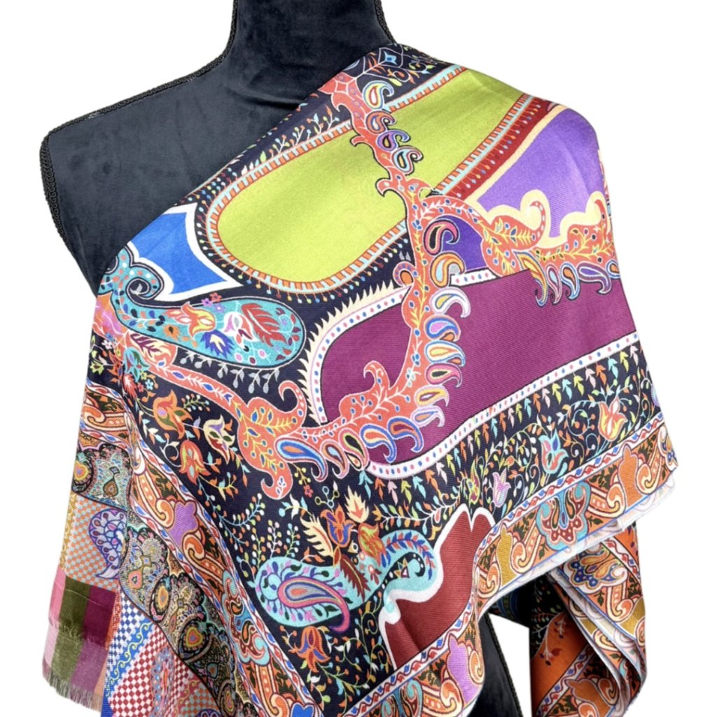Lehká a elegantní modalová šála v hnědé, fialové, zelené barvě. Barevná kombinace dělá ze šály výrazný, ale snadno kombinovatelný doplněk.