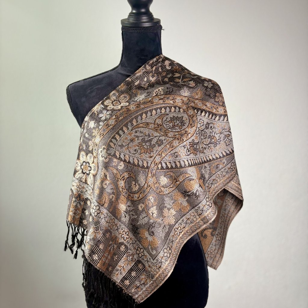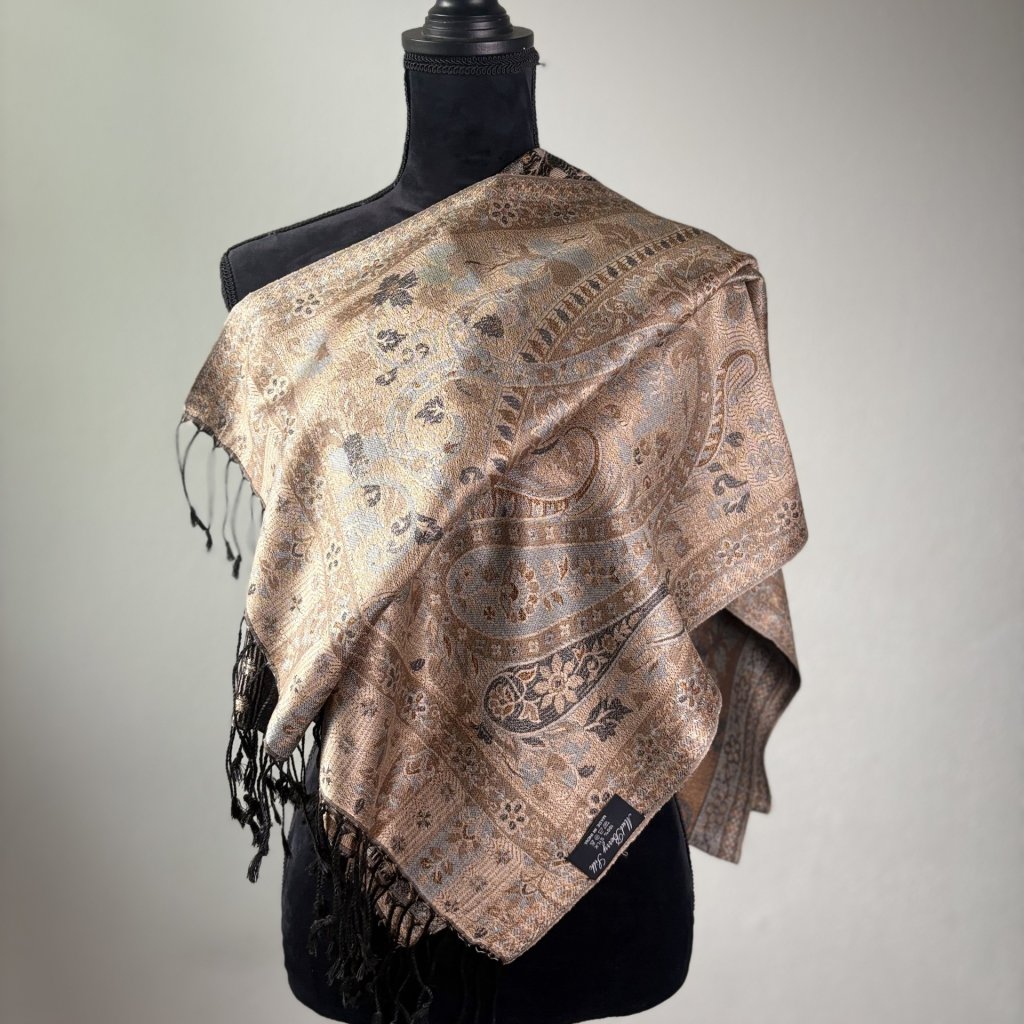 Exkluzivní šála vyrobená ze 100% morušového hedvábí, které je známé pro svůj přirozený lesk, jemnost a výjimečný komfort při nošení. Tlumené zemité tóny dodávají šále nadčasovou eleganci a snadné kombinování s různými outfity – od ležérních po formální.