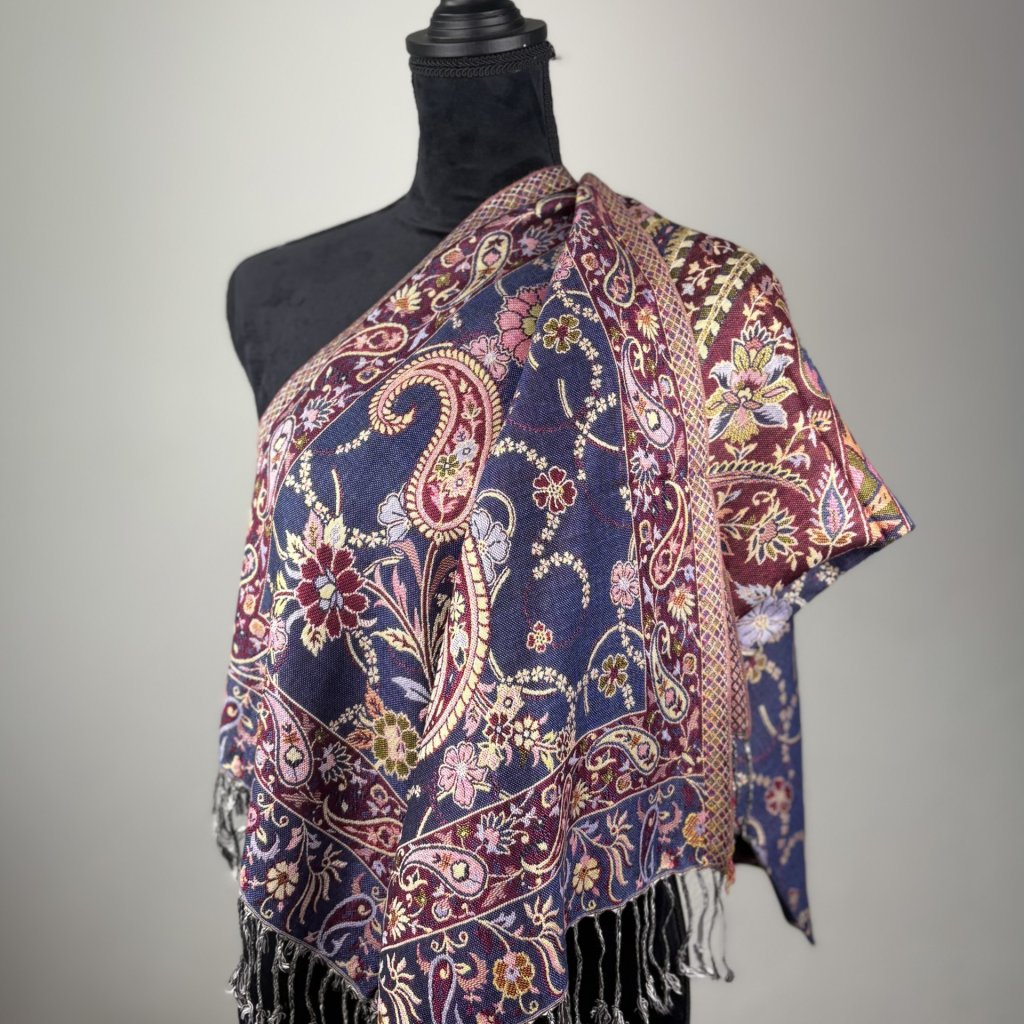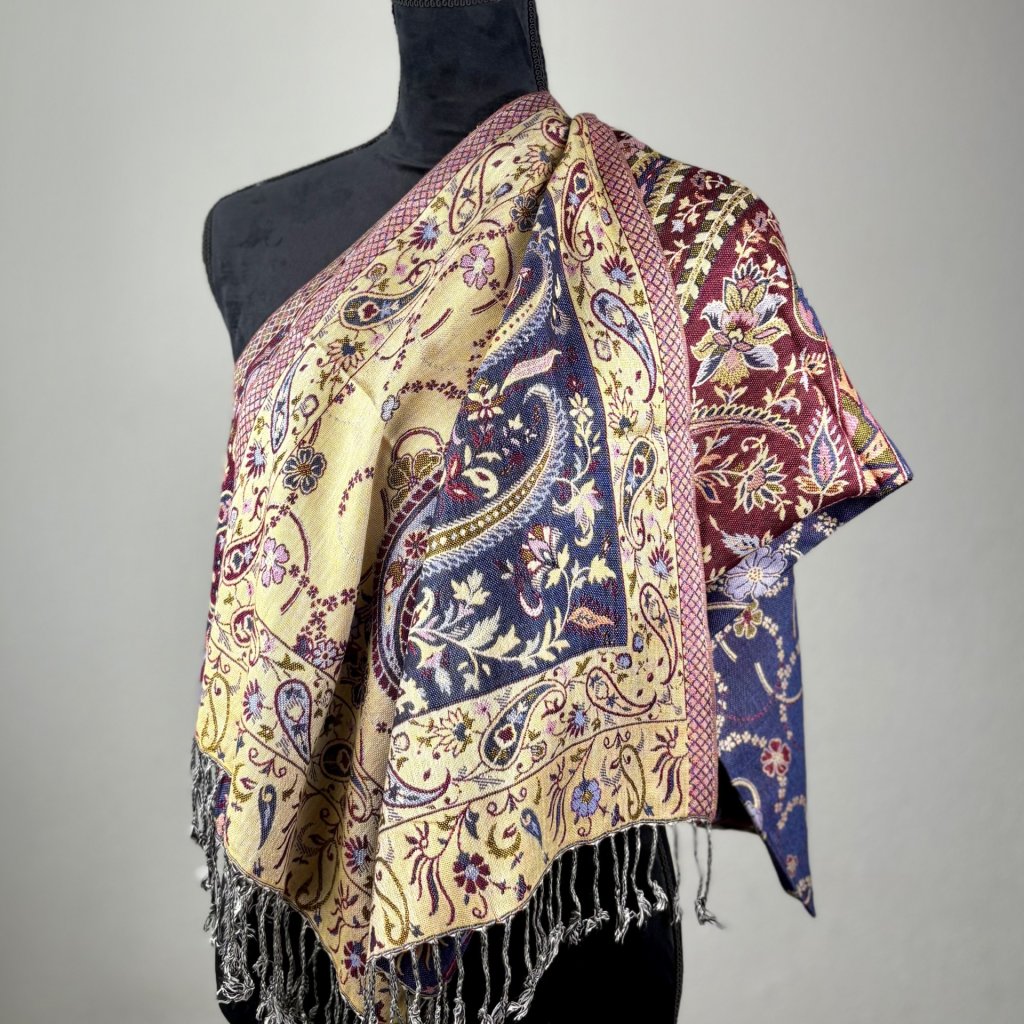 Elegantní oboustranná šála z jemné viskózy v kombinaci hnědých, fialových a žlutých odstínů. Ideální jako praktický a zároveň stylový doplněk pro každodenní nošení.