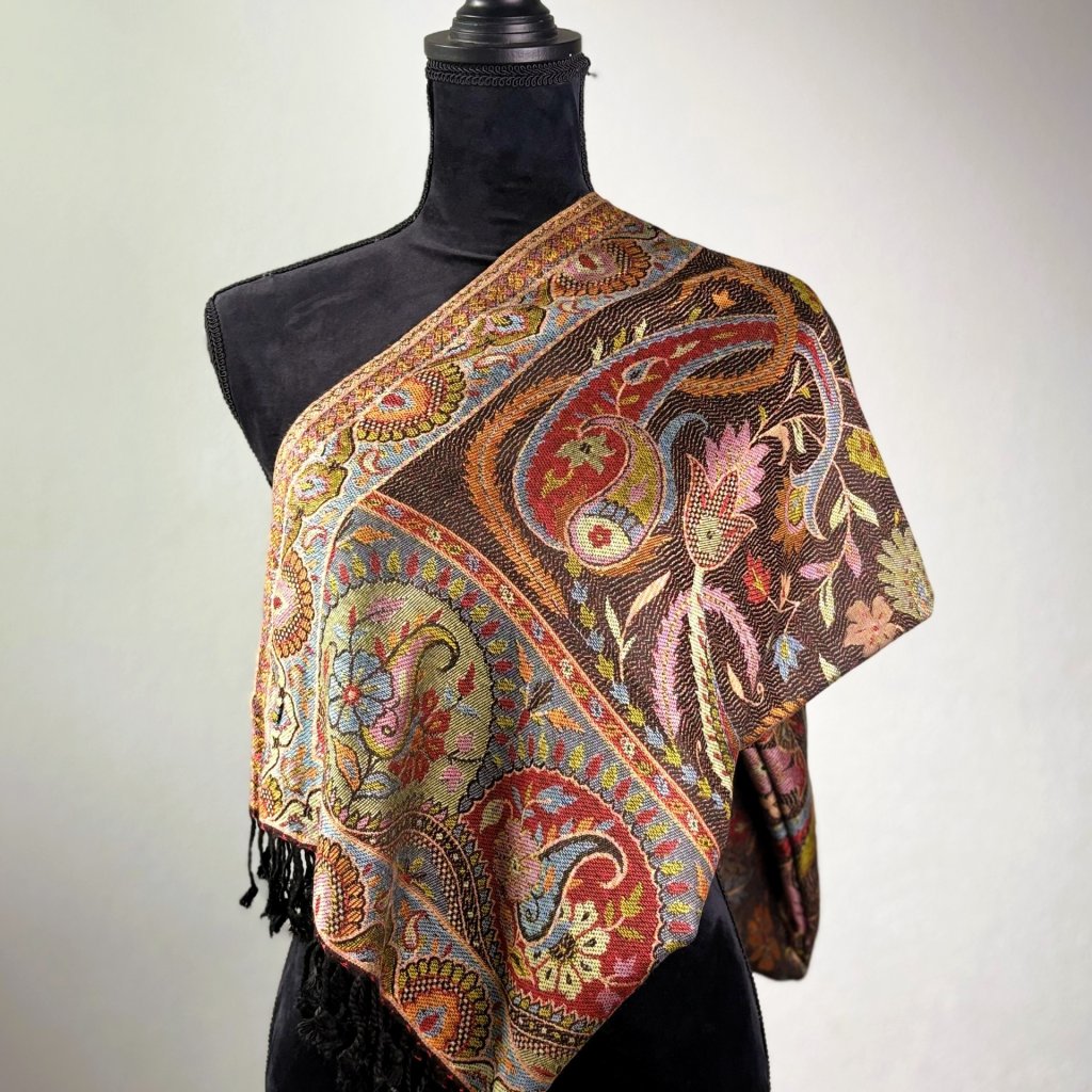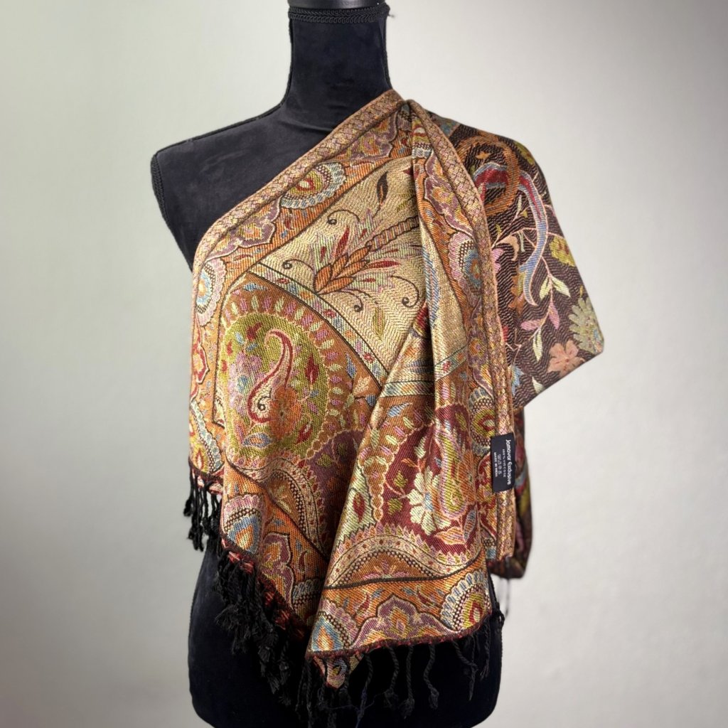 Tato šála je harmonickým spojením tradičního paisley vzoru a měkkého, vzdušného materiálu – 100 % viskózy. Teplé odstíny hnědé, vínové, zlaté a olivově zelené jí dodávají noblesní a zároveň příjemně zemitou atmosféru.