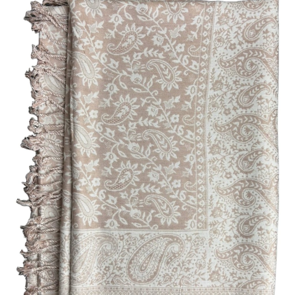 Luxusně působící šála s výrazným tkaným vzorem v béžové barvě. Viskózový materiál je měkký, příjemně hřeje a krásně splývá. Stylový doplněk, který se hodí jak ke kabátu, tak k jednoduchému svetru.