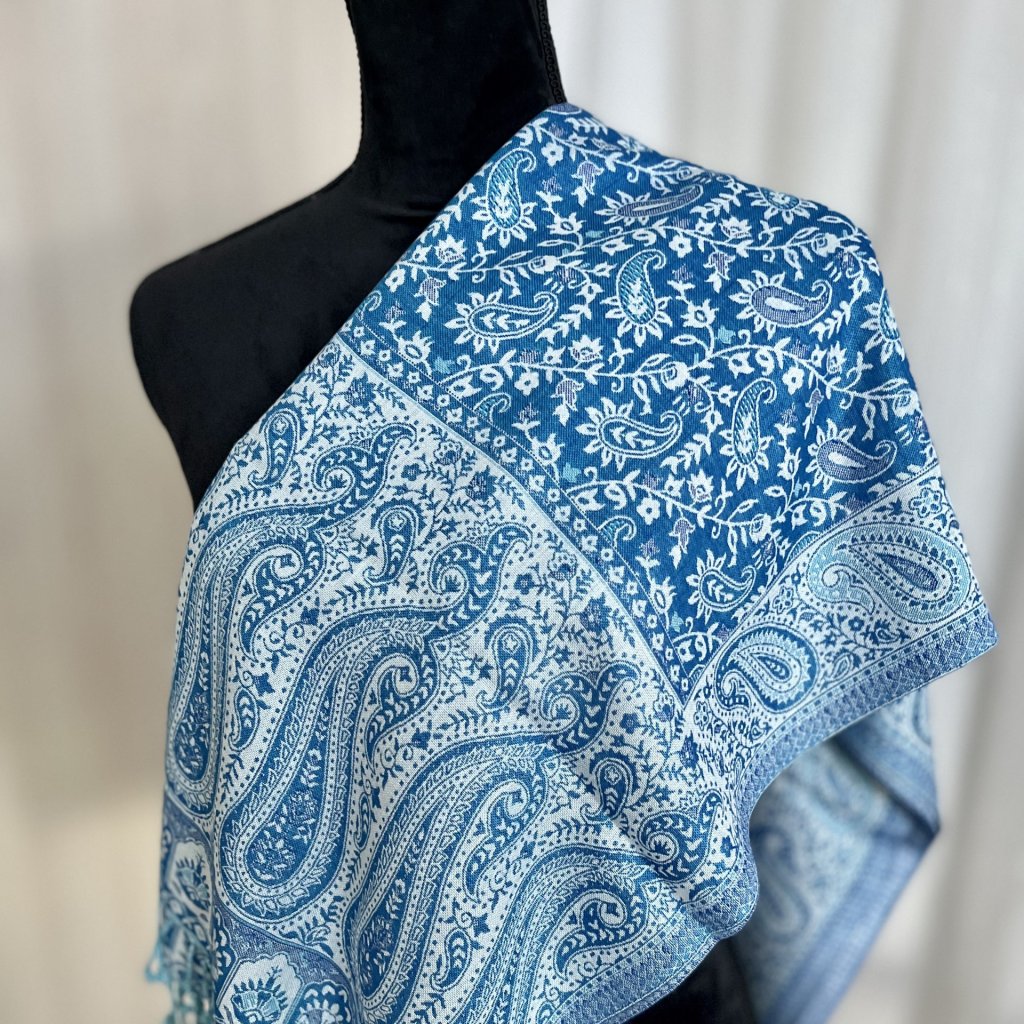 Luxusně působící šála v modro-bílé barvě. Viskózový materiál je měkký, příjemně hřeje a krásně splývá. Stylový doplněk, který se hodí jak ke kabátu, tak k jednoduchému svetru.