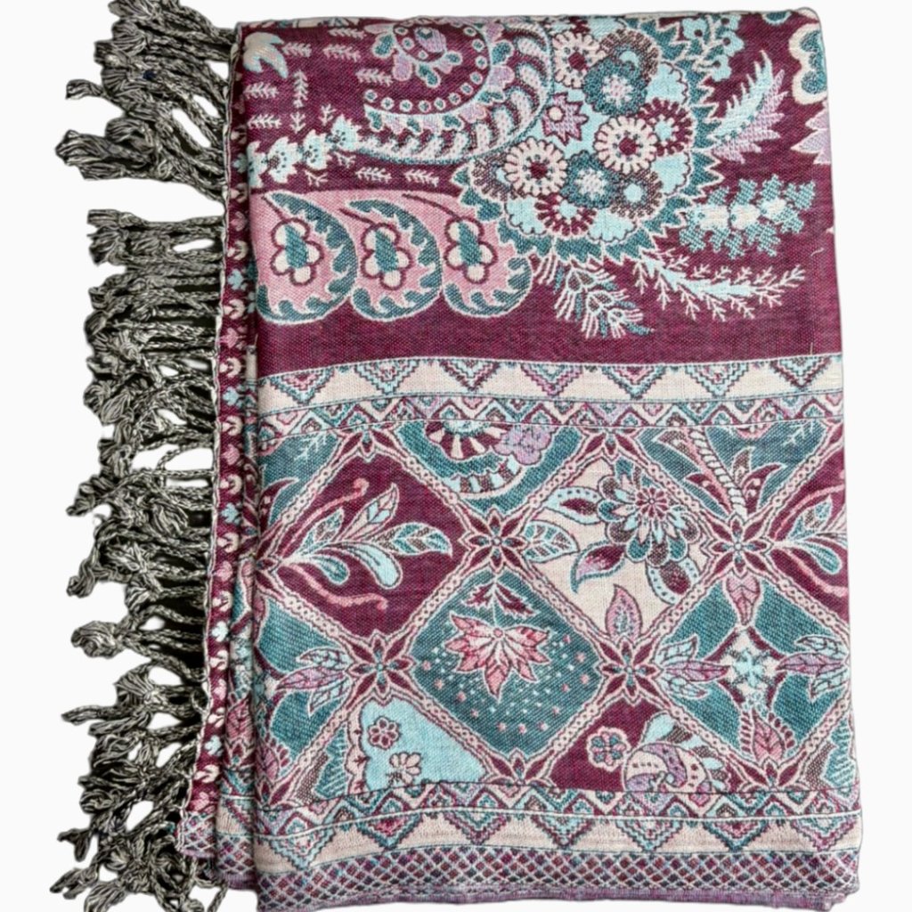 Luxusně působící šála s výrazným tkaným vzorem ve vínové barvě s tyrkysovou. Viskózový materiál je měkký, příjemně hřeje a krásně splývá. Stylový doplněk, který se hodí jak ke kabátu, tak k jednoduchému svetru.